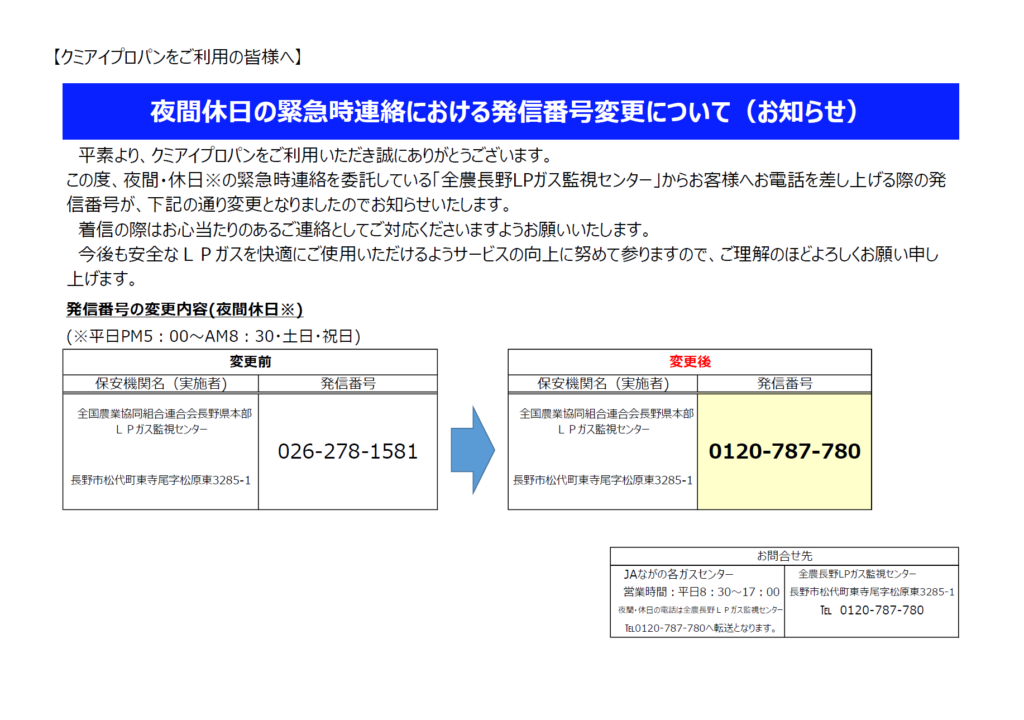 【クミアイプロパン】夜間休日の緊急時連絡における発信番号変更についてのお知らせ