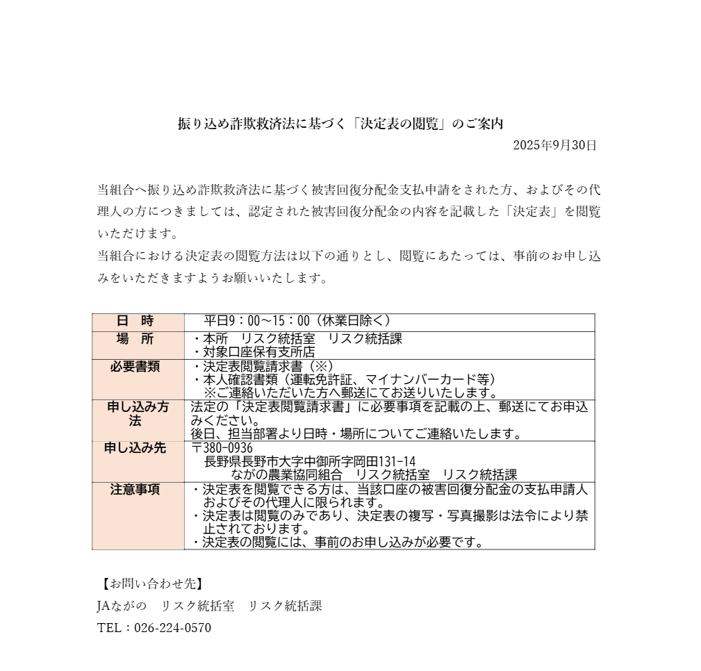 振り込め詐欺救済法に基づく「決定表の閲覧」のご案内について