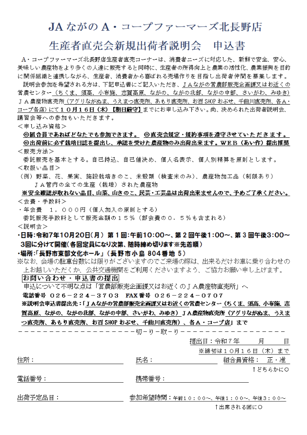 ※説明会について、完全予約制となっておりますので、お問い合わせは営農部販売企画課(026-224-3703)又はお近くのJA農産物直売所までお願いいたします。