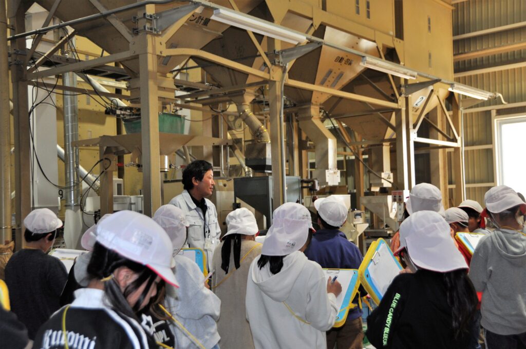 坂城町立坂城小学校の5年生児童28人が10月下旬に、社会科見学でJAながのちくまライスセンターを訪れました。児童らは「わたしたちの生活と食糧生産」の授業で、主食である米や麦類の乾燥選別・保管について学ぶために同施設を見学。収穫された米穀類が同施設に運ばれ、乾燥・選別・荷造り・検査・出荷までの一連の流れや施設内の機械の役割の説明を受け、学びを深めました。児童らは実際に玄米に調整されたコシヒカリと風さやかを実際に手に取り、品種ごとの違いを学び「どの種類の米も全部一緒だと思ったら大きさなどが違ったのでびっくりした」と話しました。説明を担当した営農技術員は「普段食べているお米はどのようにして出荷されているかを学び、地域農業に興味を持ってもらうきっかけとなれば嬉しいです」と話しました。