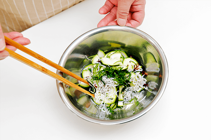 ズッキーニは厚さ2〜3ミリの輪切りにし、ボウルに入れて塩を振り全体を混ぜて10分程おいたら、水気を絞る。